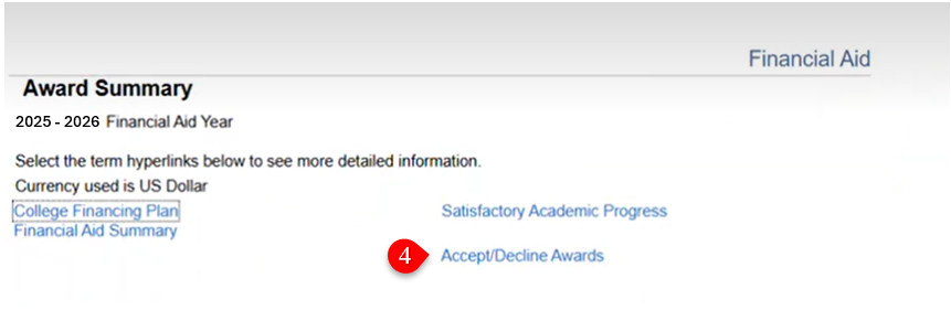 - Click on the Accept/Decline Awards link at the top of the summary page.