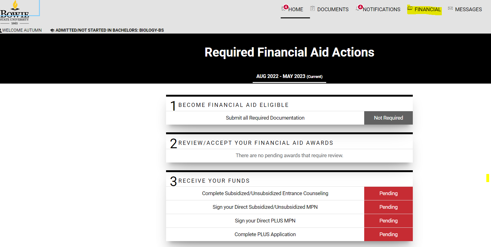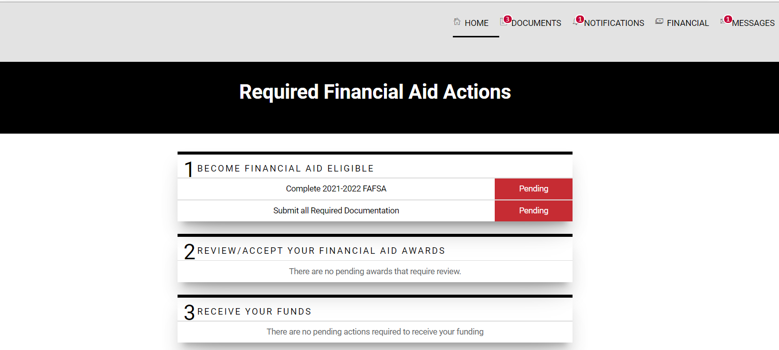 - Click On Financial, located in the top navigation bar, view your financial aid summary for the upcoming academic year.