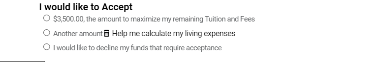 - THE AMOUNT TO MAXIMIZE MY REMAINING TUITION AND FEES: this option indicates that you are accepting the total loan amount offered to you.