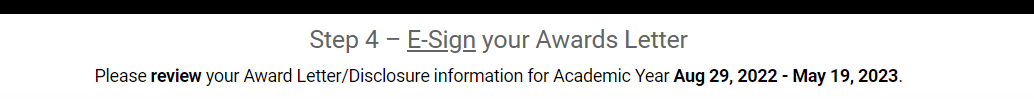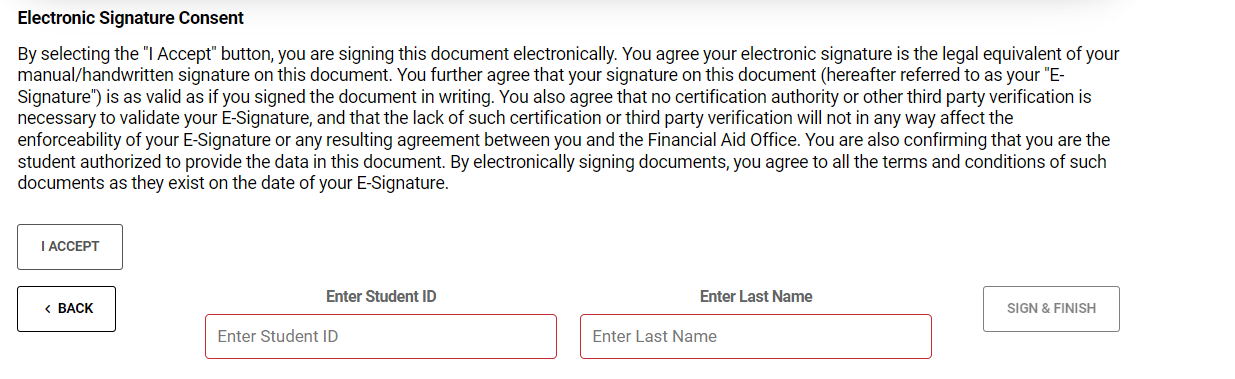 This step allows you to view an updated copy of your award letter to fully accept your financial aid award. You must complete the step below by indicating I ACCEPT and sign by entering your student ID and last name in uppercase letters. When you are done, click on SIGN & FINISH.