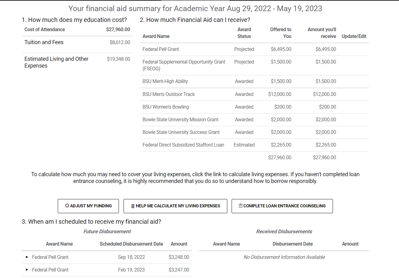 - This section provides information on the award name, status, awards offered to you, and the amount you will receive for the academic year.