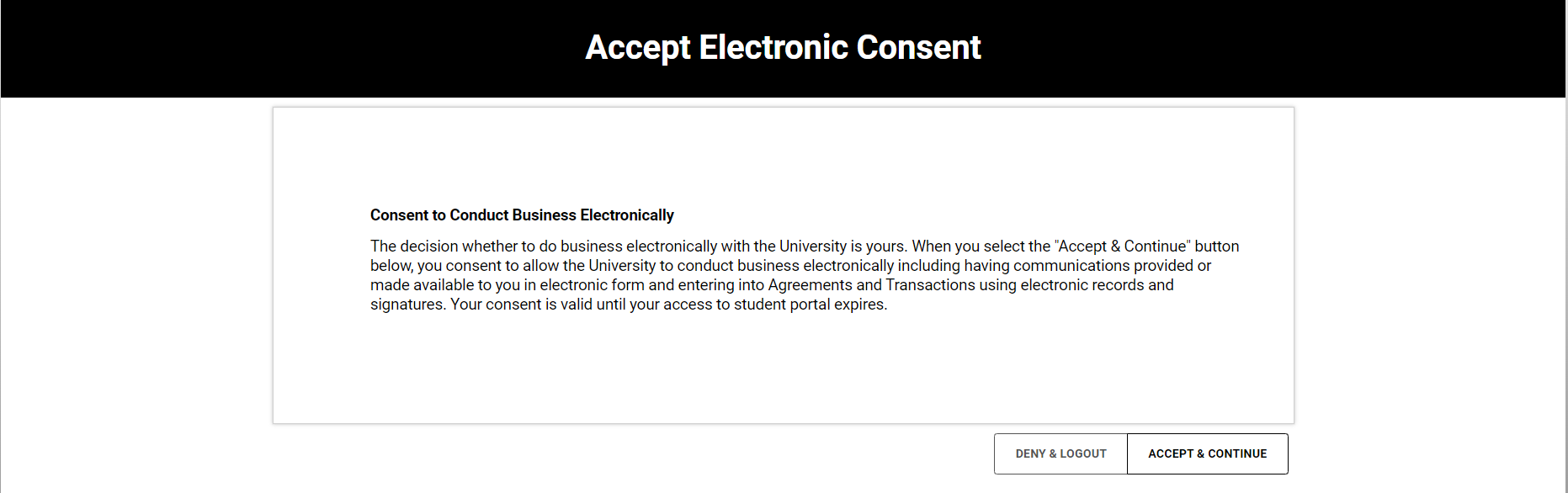 The decision whether to do business electronically with the University is yours. When you select the "Accept & Continue" button ,you consent to allow the University to conduct business electronically, including having communications provided or made available to you in electronic form and entering into Agreements and Transactions using electronic records and signatures. Your consent is valid until your access to the student portal expires.