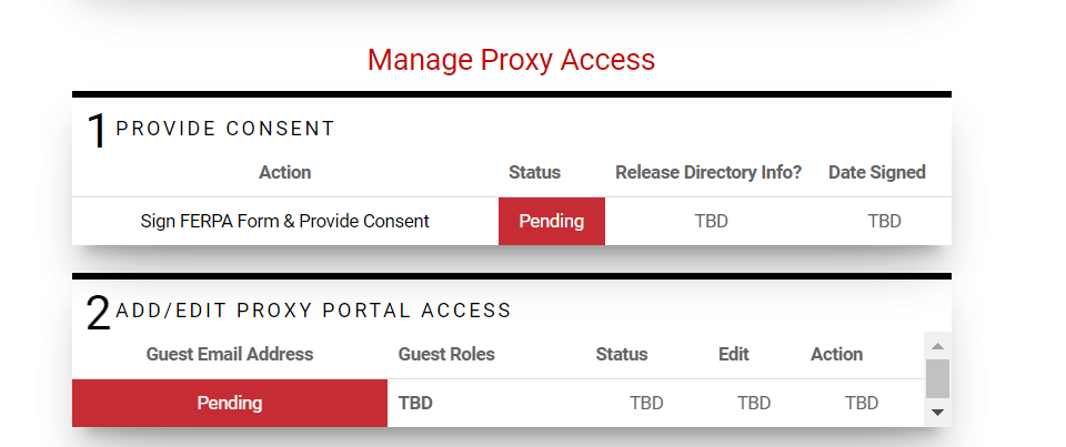 - Under Manage Proxy Access, first, provide consent to parents or guests by clicking on Sign FERPA Form & Provide Consent and completing the actions.