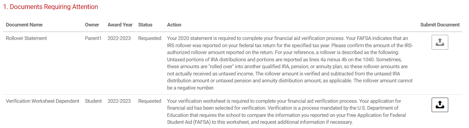 - Select the upload icon to the right of each listed item. Please note that only the document owner can upload the requested information. If the parent is the owner, only they will be able to complete their tasks once they are granted access to the system.